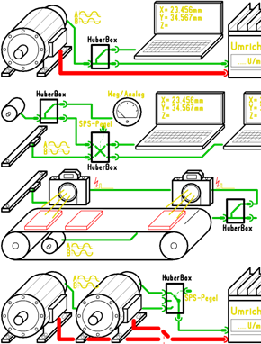 Meßsystemumschalter, Meßsystemabzweig, Pegelwandler, Kabeltreiber, Rechteckform- Oft bezogen auf Heidenhain-Produkte, werden Systemlösungen zusammengestellt , Geräte abgeändert oder deren Funktion erweitert. Die Signalspuren von inkrementellen Drehgebern und absoluten Meßsystemen werden je nach Gerät dabei quasi durchgeschleift, abgezweigt oder nach Anforderung mit SPS-Pegel umgeschaltet. Ob aufschnappbar auf Hut-Schiene, Platinen- Version oder als Alu-Druckgußgehäuse, sind besagte HuberBoxen Zulieferteil für den Anlagenbau aber auch Einzelstück fürs Labor. Standartgeräte bzw. bereits geliefertes, sind unter Produkte als Scan/pdf einzusehen. |